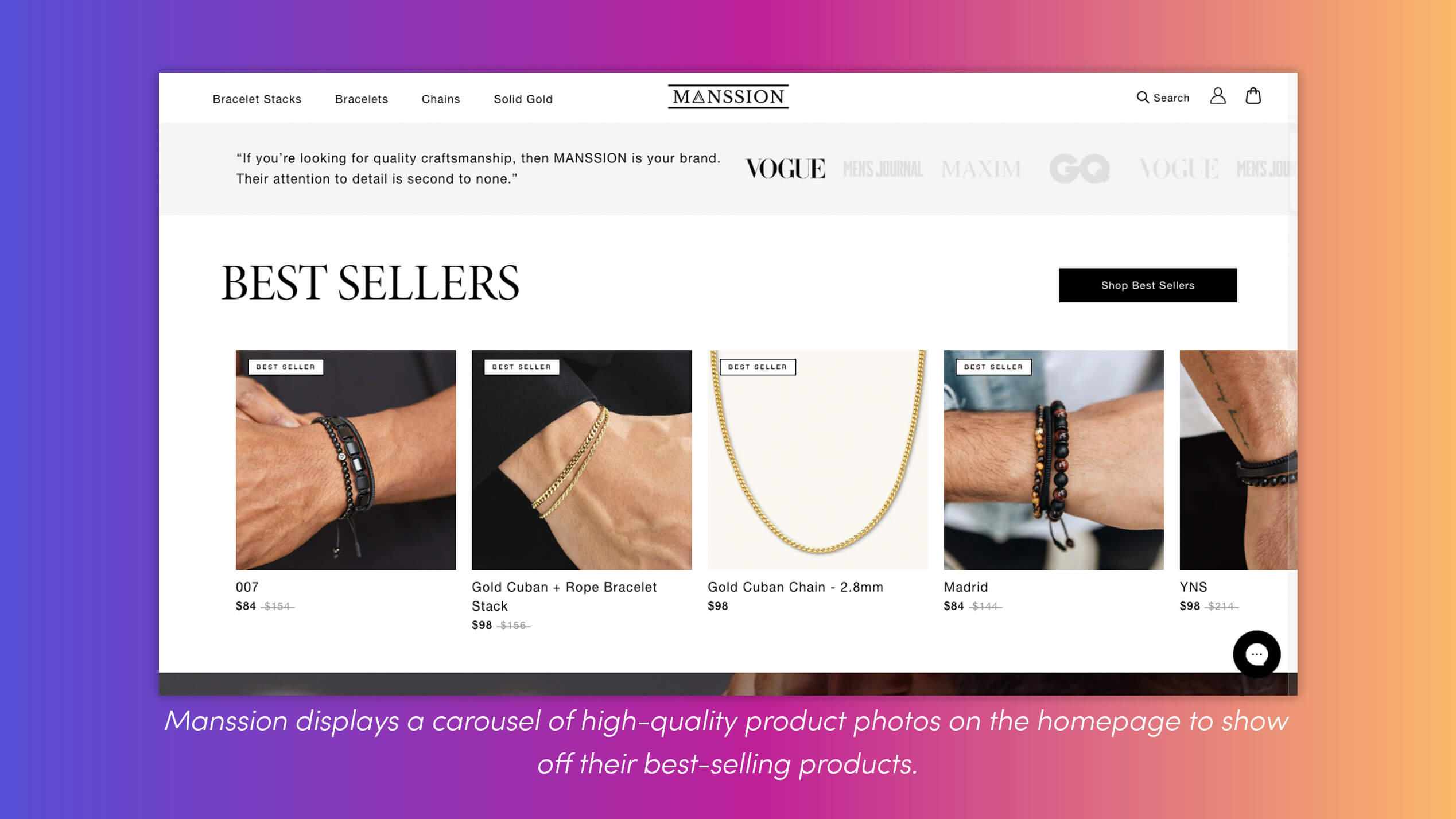 Manssion is a designer of premium men's jewelry. On their homepage , they showcase a carousel with high-quality product photos of their bestsellers . This recommendation strategy along with three other strategies has helped boost Manssion's AOV by 18.65% .
