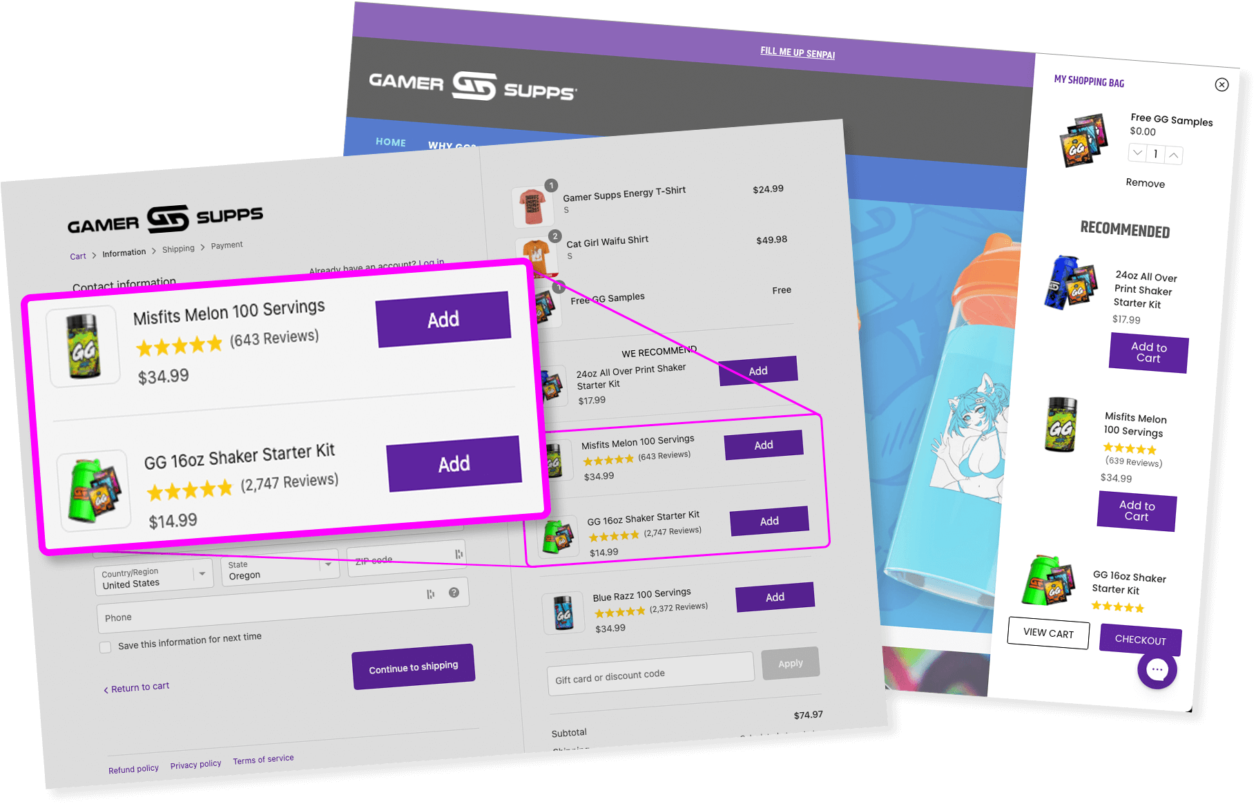 To better serve those anime fans, Gamer Supps launched a new anime-themed Waifu shaker cup. The goal was to help anime fans find the new shaker cup and discover other anime-related items via product discovery. Werk achieved this goal using Rebuy to add dynamic home page content tailored to each visitor and data-powered upsells and cross-sells in the cart flyout and at checkout.